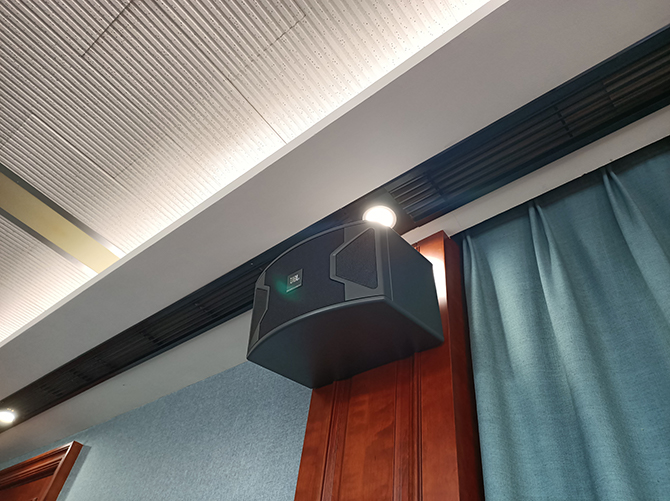 會議室的會議系統(tǒng),最重要的要求是人聲語言清晰,不產(chǎn)生嘯叫,我們在冠石科技的會議室中選用的JBL