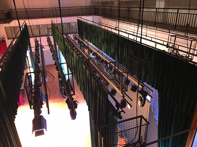 舞臺(tái)上的燈光架可升降,避免了照明不清,效果單一的情況,也方便維護(hù)