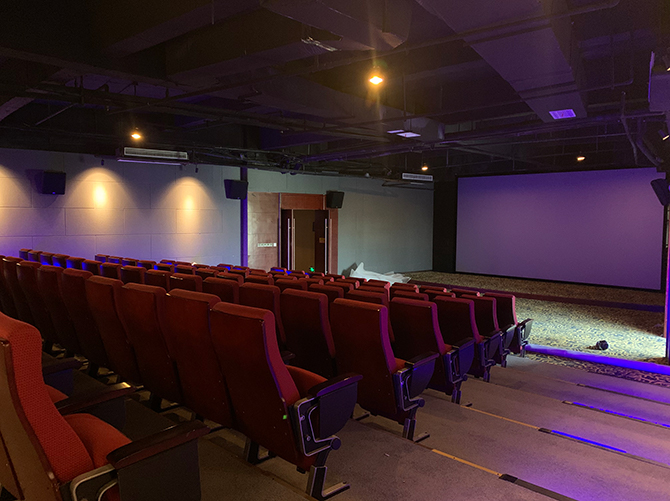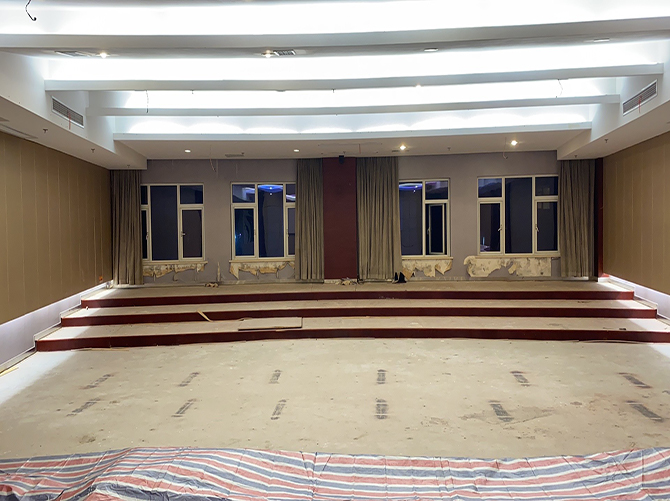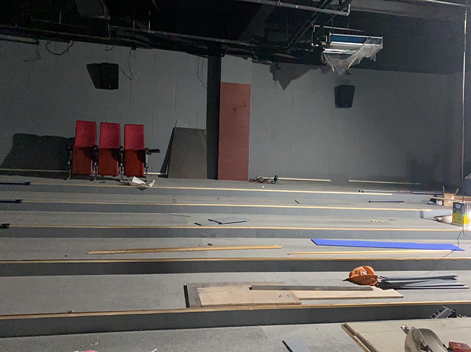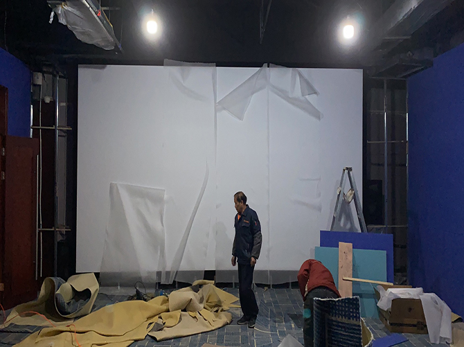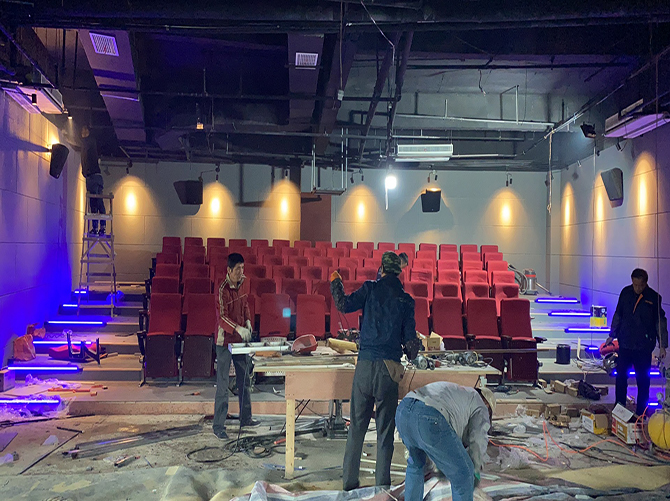 施工階段,我們先是對(duì)整體的環(huán)境進(jìn)行了改造,封堵了窗戶,將兩側(cè)的墻面拉直,同時(shí)將地面做成了影院